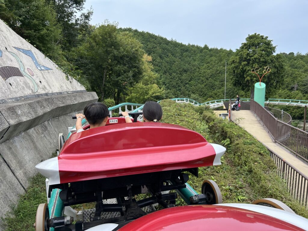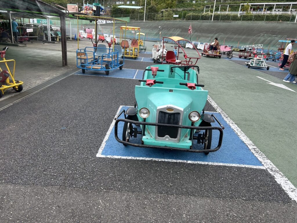 汽車型の自転車でコースを走るのですが思ったよりスピードが速くて高低差の少ないジェットコースターみたいな感じです!トンネルの中を走り抜けたりなど景色が良くて風も気持ちよかったです!