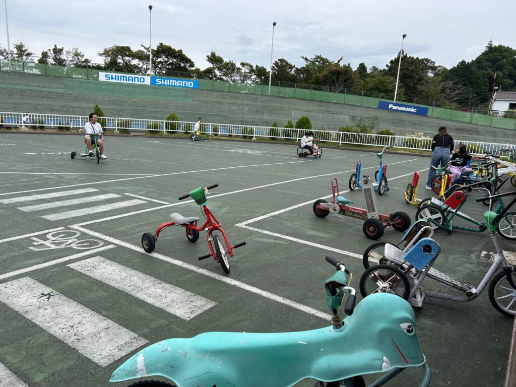 関西サイクルスポーツセンターと言えばコレですよね!一人乗りや四人乗りなど家族で遊べるユニークな自転車がいっぱいあります!ちなみにじゃばお(弟)はここで初めて補助輪なしの自転車に乗ることができるようになりました!