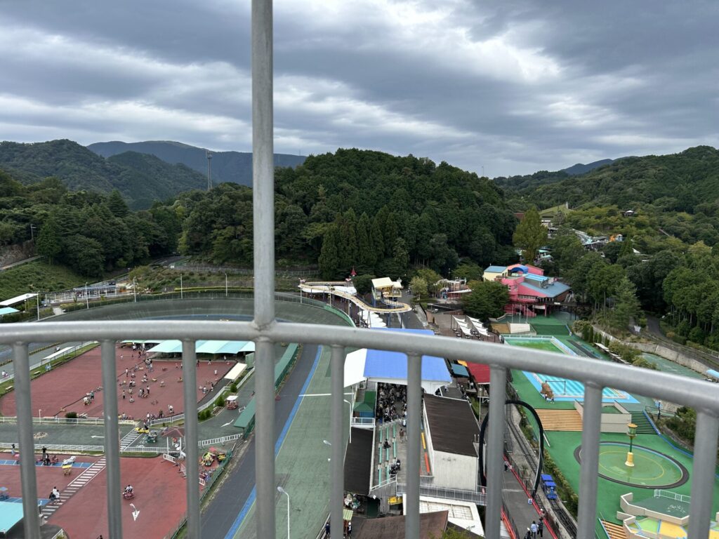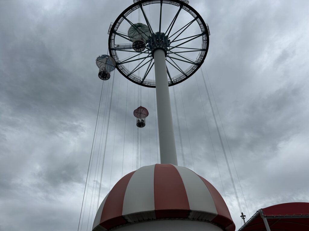 ペダルをこいで頂上を目指します!公式HPによると上空30mまで上がるみたいですが、パーク内でも高い場所にアトラクションがあるのでパーク内を一望できます!ちなみに大阪平野と神戸まで見渡せるみたいですね。上空からPLの塔は発見できました!