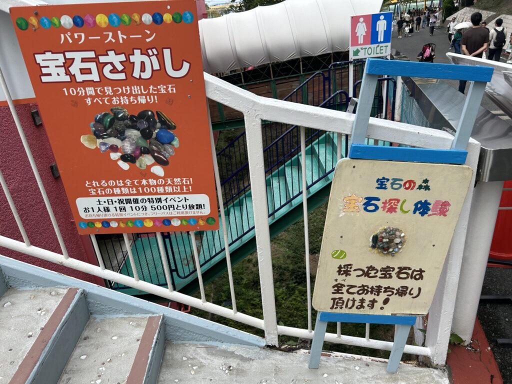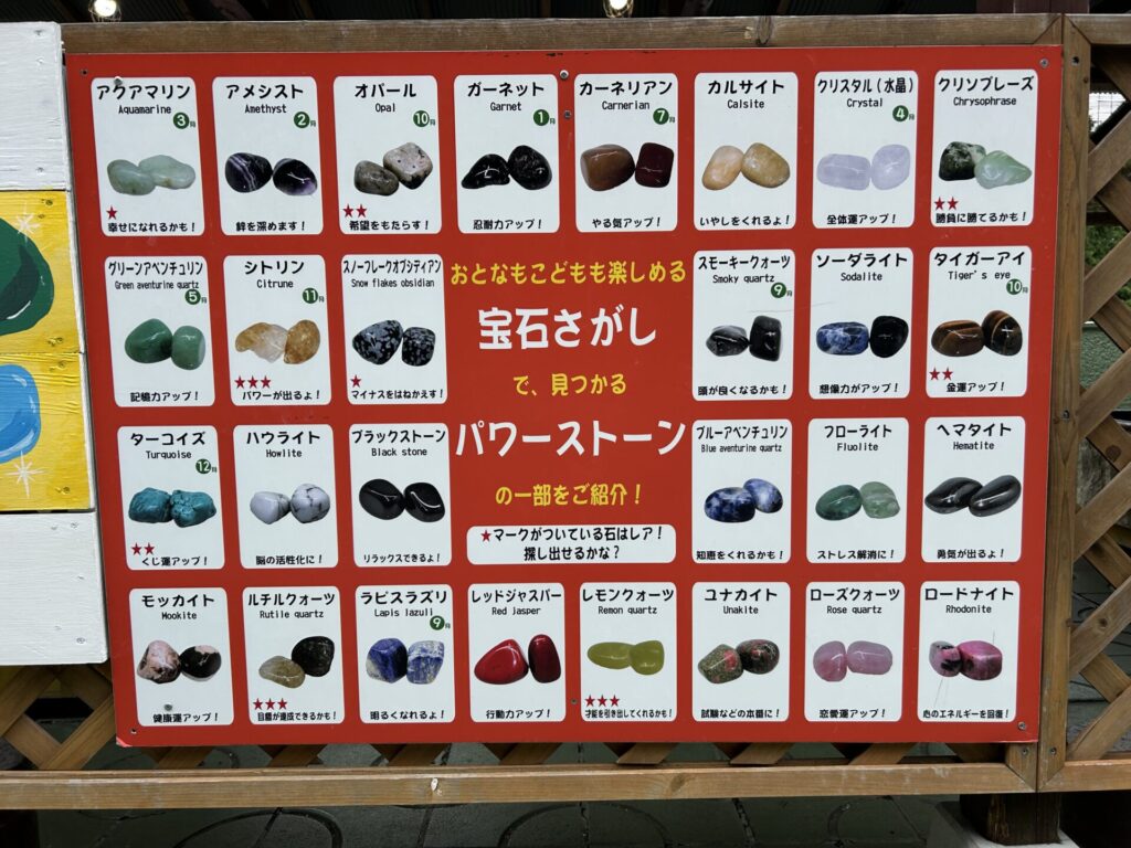 こちらはフリーパスとは別で追加料金が必要なので要注意です。いろんな種類の宝石が埋まっているので探してみてください!結構たくさん埋めてくれてるので時間が10分では足りないくらいです!誕生石が埋まっていたり、宝石にはくじ運アップや幸せ、希望、勝負運などそれぞれに意味もあるので取れた宝石を家で調べてみるのも楽しいですよ★マークはレアみたいなので↓↓↓の写真を参考にしてみてください。