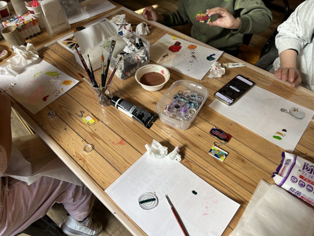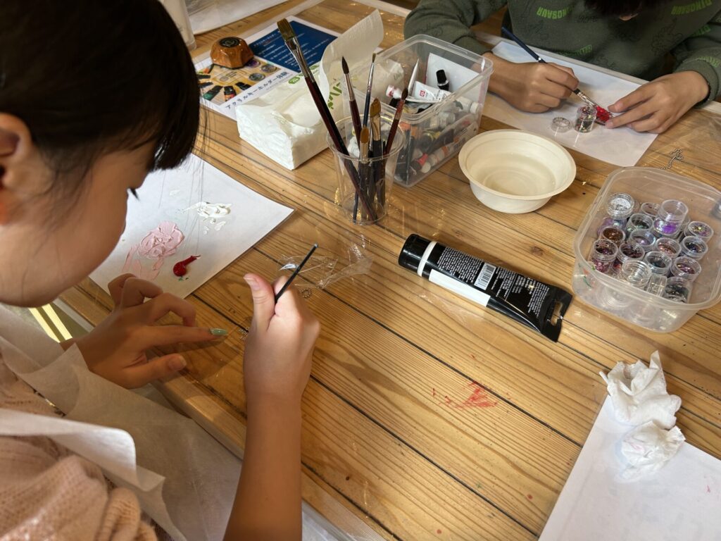 こちらはお正月限定プランですがアクリルキーホルダーづくりの体験もできました!元の形が3種類ぐらいあって、そこに絵具やキラキラのラメを入れたりするのですが個性が爆発しますね!