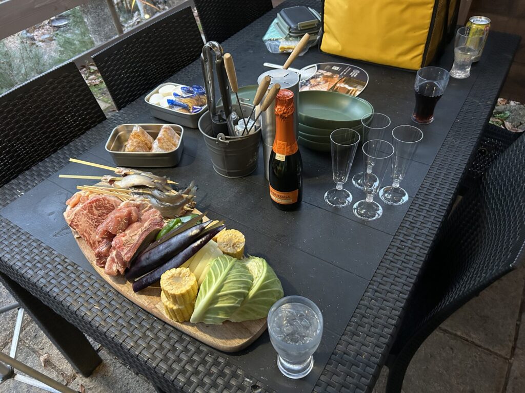 BBQはこれで4人分です!お肉(牛・豚・鶏・ウインナー)・鮎・野菜・焼きおにぎりなどすべて揃ってますね!大人2人・子供2人ですがお腹いっぱいのボリュームでした!あとお正月プラン限定でシャンパンもいただきました✨
